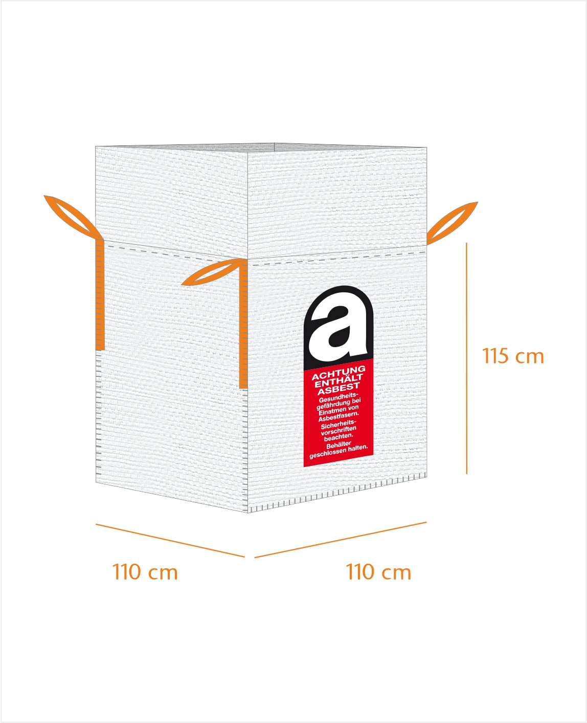 Der BigBag ASBEST 110 x 110 x 115 cm kommt zum Einsatz, wenn die Mengen größer werden. Er ist beschichtet, hat eine Schürze und eine Traglast von 1.500 kg. Durch 4 Hebeschlaufen lässt er sich leicht transportieren. Bei der Entsorgung von Asbest werden in vielen Fällen krebserregende Fasern freigesetzt. Asbest muss daher immer ordnungsgemäß verpackt werden. Warndruck Asbest.